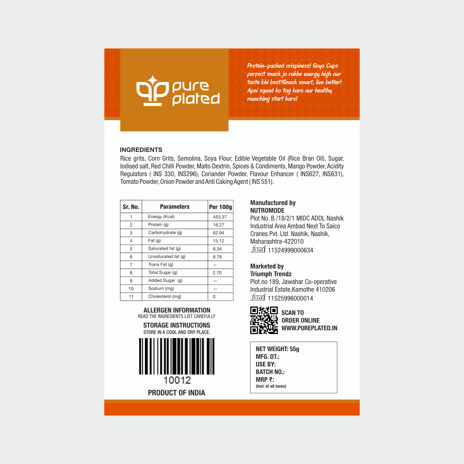 The spice of India meets modern nutrition with our healthy Soya Cups (Masala Munch). Crafted from protein-packed soya flour and natural grains, each cup is baked until perfectly crisp, then coated with a vibrant mix of red chilli, coriander, tomato, and mango powder. The result is a snack that’s full of flavour, not oil. The masala hits all the right notes, a little tangy, a little spicy, and completely addictive. Rich in plant protein and fibre, these cups make the perfect snack when you want something bold yet nourishing. They’re great for tea-time, gatherings, or anytime hunger strikes. Searching for healthy Soya Cups (Masala Munch) online? You’ve just found the ideal balance between taste and nutrition. Real ingredients, clean energy, and pure flavour, it’s everything a good snack should be.